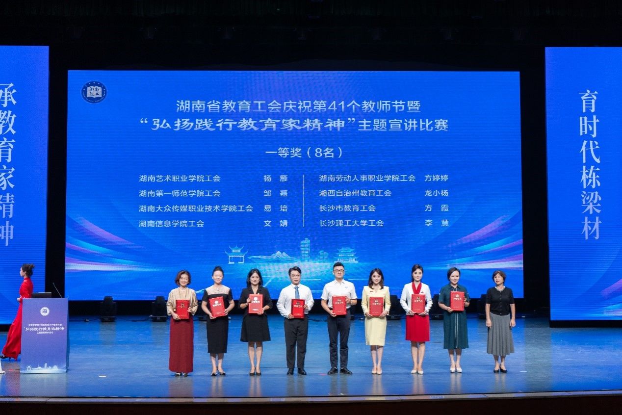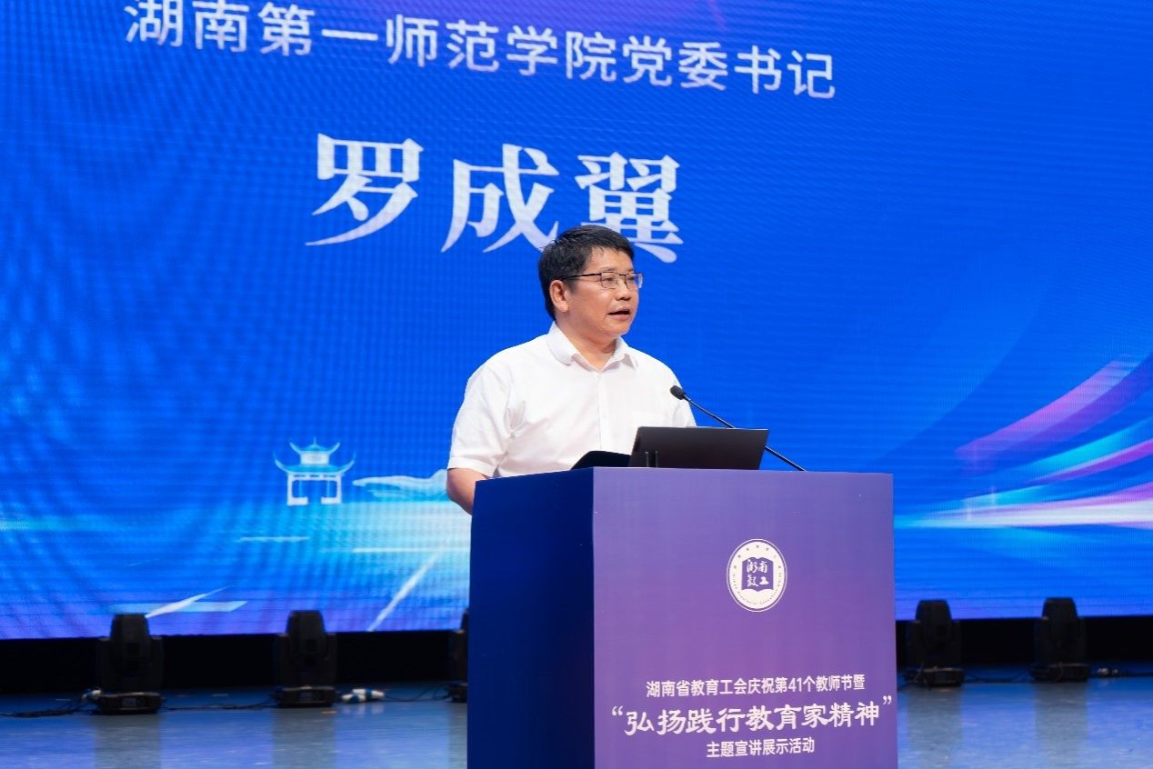 在浩瀚师恩中聆听教育家精神的时代回响!9月5日上午,由湖南省教育工会主办的庆祝第41个教师节暨“弘扬践行教育家精神”主题宣讲展示活动在我校举行。