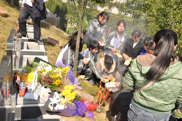 “我们班48名同学一起动手,折出了几百个千纸鹤,每一个千纸鹤上都有我们想要对她说的话,我们只希望她在另一个地方不会孤单!”参与葬礼的晓雨的同学代表刘毅等和其家人很小心的将纸鹤撒在墓前的火炉里,默默的看着它们烧成灰烬。