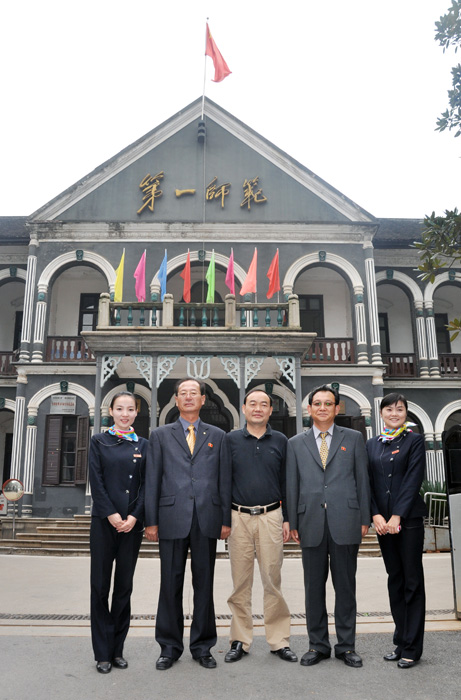 参观团所有成员胸前佩戴着彩色的金正日像章,此次来长主要参观中共湘区革委会旧址、青年毛泽东纪念馆、岳麓山爱晚亭、岳麓书院、花明楼刘少奇故居等红色景点。他们对我院青年毛泽东纪念馆特别钟情,个个认真听取讲解员和翻译的精彩讲解,非常高兴地参观了每个景点,有的还边听边认真作记录。特别是在当年毛泽东求学的八班教室,客人们依次坐在主席当年的座位上留影纪念,有的客人将镜头对准八班同学的合影寻找