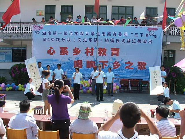 7月19日上午,我院大学生志愿者暑期“三下乡”社会实践文史系分队在郴州市桂东县新坊乡溪源小学举行以“心系乡村教育,唱响下乡之歌”为主题的捐赠仪式暨汇报演出。桂东县委宣传部陈应时副部长、团县委郭昕书记、新坊乡党政领导、溪源村领导及学生家长和群众近400人出席捐赠仪式并观看了演出。