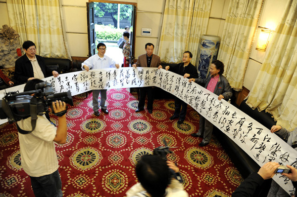王教授说,一师是培养开国领袖毛泽东的摇篮,毛泽东的诗词、毛泽东的书法他一直都很喜爱,尤其是毛泽东的思想他特别推崇。他强调,毛泽东的思想是我们取之不尽、用之不竭的思想源泉,是永远不会过时的,他要以一位华侨华人艺术家的亲身经历和实际行动告诉大家、特别是要告诉已经富起来的中国人,不要忘记毛泽东的思想。今天他来到一师缅怀主席并聘为一师的客座教授,这让他再一次深受感动。王教授透露,他将于10月20日左右来湘举办“湖湘行”书画展,其书画作品将全部以伟人毛泽东、湖南老一辈无产阶级革命家和湖湘的山水风情作背景,将自己的湖南情、一师情融入其创作中。王德水教授把在5月17日特地书写的毛泽东的《沁园春·长沙》作品赠给学院,作品长度设计为9.9米,独具深刻寓意。他说:一是“九”表至尊;二是九月九日是人们纪念、缅怀、祭奠伟人毛泽东的日子,9.9米寓意为世人永远怀念伟人毛泽东!