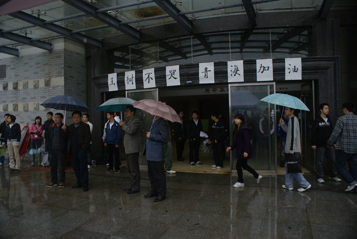 玉树不哭 青海加油——我院师生冒雨哀悼玉树地震遇难同胞