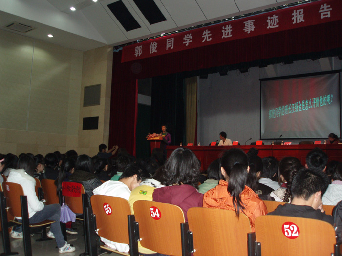 报告会开始,院党委宣传部陈志武部长老师首先系统地介绍了郭俊同学在人民群众生命受到严重威胁的危机关头,不畏严寒,不怕牺牲,挺身而出抢救落水儿童的先进事迹,并充分肯定了郭俊同学的英雄壮举。陈部长指出,当代大学生是我国社会主义现代化建设的后备军,但是由于受当今社会中一些不良因素的影响,我们这一代大学生在面对时代所赋予的责任时,却表现出迷茫和浮躁,甚至精神缺失,而郭俊同学的英雄事迹以及所表现出来的精神正是我们广大大学生心里所呼唤的,所需要的。他是我们今天年轻学子的榜样,我们要好好学习。陈部长说,在当今高校中,都高度重视校园文化建设,校园文化建设的重点内容就是校园精神文化建设,也可以说是校园文化的最高层次。在对学生进行精神文化培育的过程中,运用榜样进行示范,可以起到事半功倍之功效。陈部长最后强调,以后,我们学院要多开展类似的报告会,让这些先进事迹和先进人物来感染我院的每一位师生,推动我院的校园文化建设。