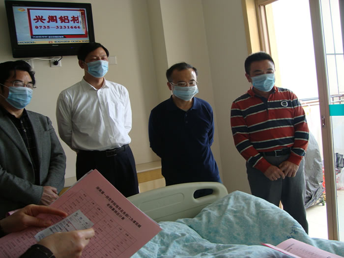4月29日上午,院党委书记詹小平、院长彭小奇、副院长李克勤、 院纪委书记阳柏苏在院工会汤晓老师和外语系陈友良主任、赵花云书记、欧阳伶俐副书记、刘永红、陆明涛、毛浩蓉等老师陪同下到湘雅附三医院探望了身患尿毒症的外语系老师谭双顺,送去了110659.2元的师生捐款,表达了学院党委和行政对谭双顺老师的关爱,转达了全院师生对谭双顺老师的祝福。