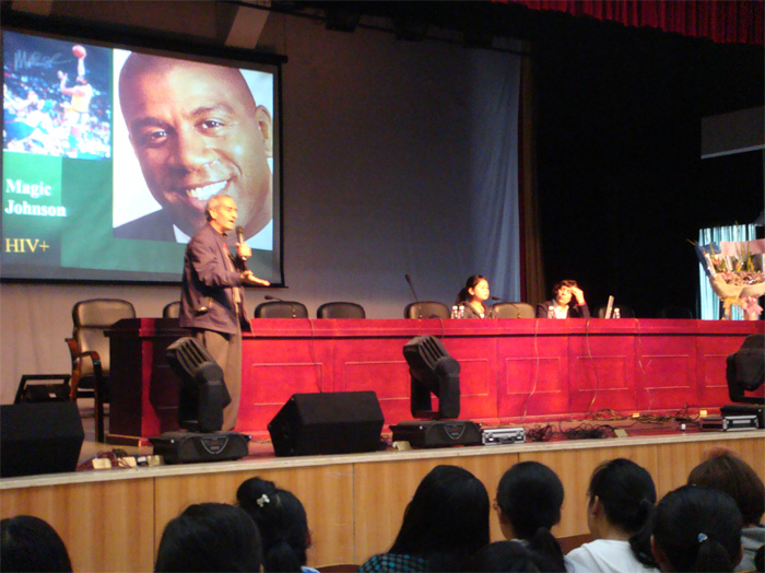 在我院的宣讲中,加德里安教授及其夫人萨拉女士以生动的演讲、幽默的语言,配合大量图片,给同学们讲授了艾滋病毒的传染性和传播方式,并介绍了当今社会艾滋病传播的情况,以及有效预防艾滋病的方法。