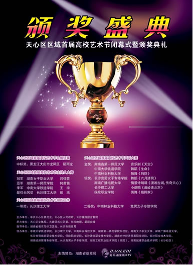 历时3个多月的“魅力天心,青春飞扬”天心区区域首届高校艺术节闭幕式暨颁奖典礼于2010年1月9日,在田汉大剧院音乐厅举行,来自区域内15所高校的学子共享这场魅力独具的青春盛宴。我院校园文化艺术团在本届艺术节中荣获风采展示赛的金奖,主持人大赛的亚军,展示了一师学子的青春魅力。