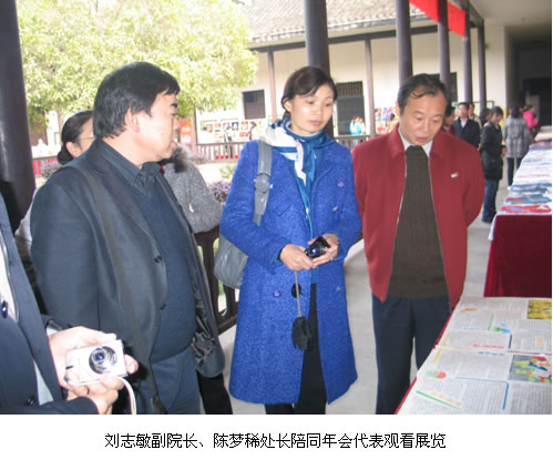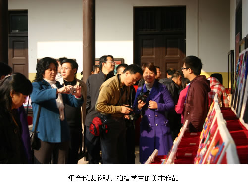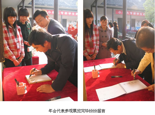 11月14日下午,作品展迎来了第一批尊贵的来宾——2009年全国教师教育学会小学教师教育委员会年会代表。年会代表们在我院刘志敏副院长、教务处陈梦稀处长和小教大专部蔡海军副书记的陪同下非常欣喜地参观了展览。他们兴趣盎然地问这问那,赞不绝口,纷纷拍下许多照片。还有许多代表在看完展览之后欣然写下感言:“第一师范,名不虚传”、“千年学府,百年老校,人才摇篮,中华希望”、“文化传承,特色鲜明”、“师范传统,毕现一堂”、“一师的学生们真幸福”……