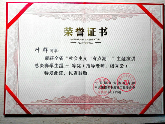 9月24日,湖南省“社会主义有点潮”主题演讲比赛总决赛在湖南省教育电视台举行,我校马克思主义学院2016级思政一班叶群荣获学生组一等奖。