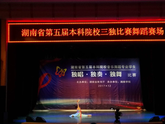 2017年12月2日,湖南省第五届普通高校音乐舞蹈本科专业学生独唱、独奏、独舞比赛在郴州进行。此次大赛由湖南省教育厅主办,湘南学院承办,全省20余所高校选送学生参加比赛,共有200多名音乐舞蹈本科生和研究生分别参加民族唱法、美声唱法、通俗唱法、民族乐器、西洋乐器、钢琴、现代舞、古典舞、民间舞9个项目的角逐。