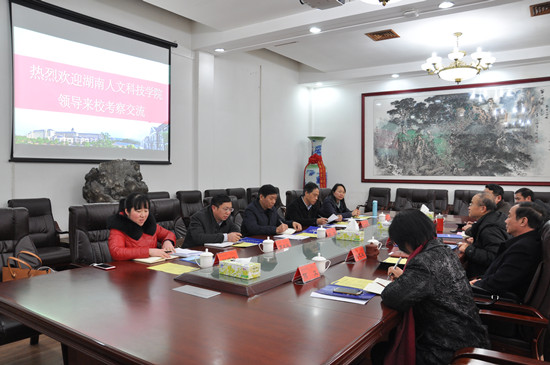 3月20日下午,湖南人文科技学院党委书记郭军、副书记刘铁铭一行5人来我校考察交流。