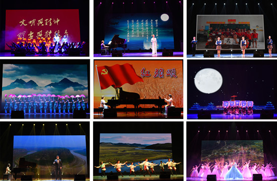 晚会共分为缅怀伟人、践行初心、放飞梦想三个主题篇章。开场舞《奋进新时代》以轻快的节奏,欢乐的旋律,尽显一师的蓬勃朝气,展现出新时代一师人对祖国的热爱和为教育事业付出的决心。在“缅怀伟人”篇章,大合诵《毛泽东经典诗词诵读》,深情诵读了伟大校友毛泽东的经典诗句,展现出毛泽东的革命人生与磅礴情怀,表达一师师生对伟人的崇敬与怀念;"寂寞嫦娥舒广袖,万里长空且为忠魂舞",钢琴伴奏独唱《蝶恋花·答李淑一》的词为毛主席抒发悼念情感之作,表演者一声开嗓便震撼人心,饱含深情的唱词让在场观众无不深受感染,真切体会到了革命先烈们生死不渝的情怀。在“践行初心”篇章,朗诵《我的学生我的爱》,讲述了毕业后回到郴州桂东县四都镇乡村小学任教的我校4位校友在工作中的感人故事,让观众真切感受到师范毕业生在教育路上从稚嫩到成熟的成长历程,同时,表达了一师学子献身农村基础教育的坚定信念;双钢琴《红旗颂》以宏伟庄严的旋律表现了中国人民英勇顽强、奋发向上的革命气概,热烈讴歌了伟大祖国蒸蒸日上的繁荣景象;歌曲《黄河颂》大气磅礴,让人热血沸腾;书画《翰墨诗情映丹青》节目在古韵的墨香中穿越书法的妙境、体会超越喧嚣的翰墨诗情,伴着优雅的琴韵让人回想到这样一段故事:1918年4月,新民学会成立,6月,毛泽东等一师学子即将毕业,为寻求救国救民之路,新民学会资助罗章龙先行东渡日本。临行前,毛泽东作了一首充满了依依惜别之情又洋溢着浩然之气的《送纵宇一郎东行》为其送别。美术与设计学院书法学专业的毕业生代表在临别之际,特书写此诗,以表达对伟大校友的深切怀念,也以此鼓励一师毕业生,走向社会,追逐自己美好的人生之梦、中华民族伟大复兴之梦。在“放飞梦想”篇章,啦啦操《舞动青春》活泼热情,展现出年轻一代一师学子的蓬勃朝气,高超炫丽的技艺点燃全场激情,近年来,我校学生健美操啦啦操运动队表现优异,连续7年蝉联湖南省大学生健美操比赛团体总分第一名,并斩获58枚单项金牌;“恰同学少年”合唱团带来的合唱《雪花的快乐》《鸿雁》将曲风截然不同的两首歌曲巧妙融合,高低起伏,刚柔并济,寓意辽阔的天空任飞翔。