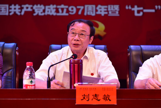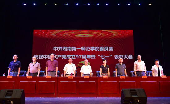 6月29日下午,我校在田汉剧场隆重召开庆祝中国共产党成立97周年暨“七一”表彰大会。校领导彭小奇、童小娇、刘志敏、刘鸿翔、李克勤、刘宇、曹兴、李昱、江正云以及全体师生党员,离退休党总支、一二附小党员代表参加大会。会议由校党委副书记刘志敏主持。