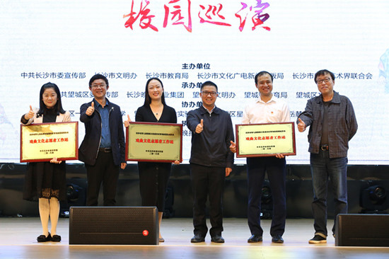 活动现场,长沙市委宣传部授予斑马湖小学“戏曲文化志愿者工作站”称号。授予教师杨青、彭硕、刘遮“长沙市戏曲文化志愿者”称号,学生周艺萌、史海权、李泽恺“长沙市小小戏曲传承人”称号。