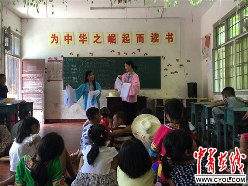 大学生在教室给小朋友们表演湘剧《描容上路》片段