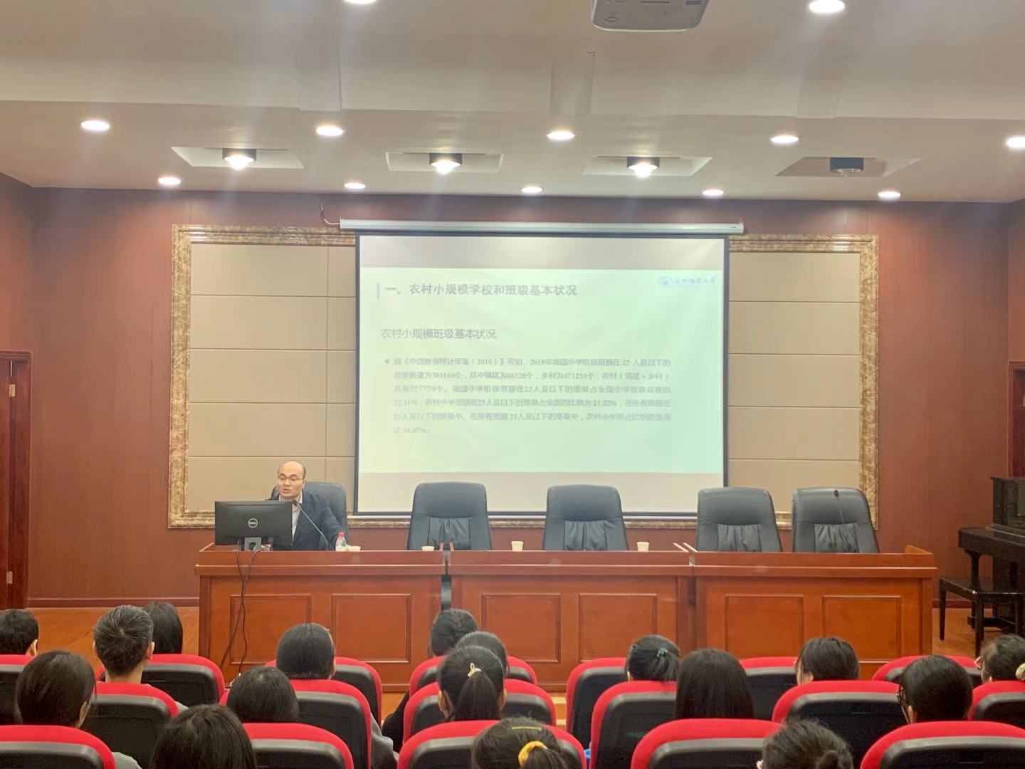 秦玉友教授从“教”“学”和“师生互动”三个维度阐述了农村学校小班教学中个体化教学更有利于实施、学生参与机会增加、班级纪律问题减少等潜在优势,从教育认知和教学实践两个方面指出了目前农村学校小班教学存在的现实问题。他指出,创新农村学校小班教学实践指导、培训与推进方式是把农村学校小班所拥有的潜在教育优势变成农村学校小班的现实教育特征的重要方式。讲座中,秦教授提出了“早期的语言发展代表着一个人的思维水平”“真实的学习应发生在每一个学生自己身上”“调整班级规模时应考虑调整是为实现什么样的功能和目标”等一系列真知灼见。他以通俗、平实的语言娓娓道来,既有案例研究的分享,也有经验心得的交流,师生们颇受教益。