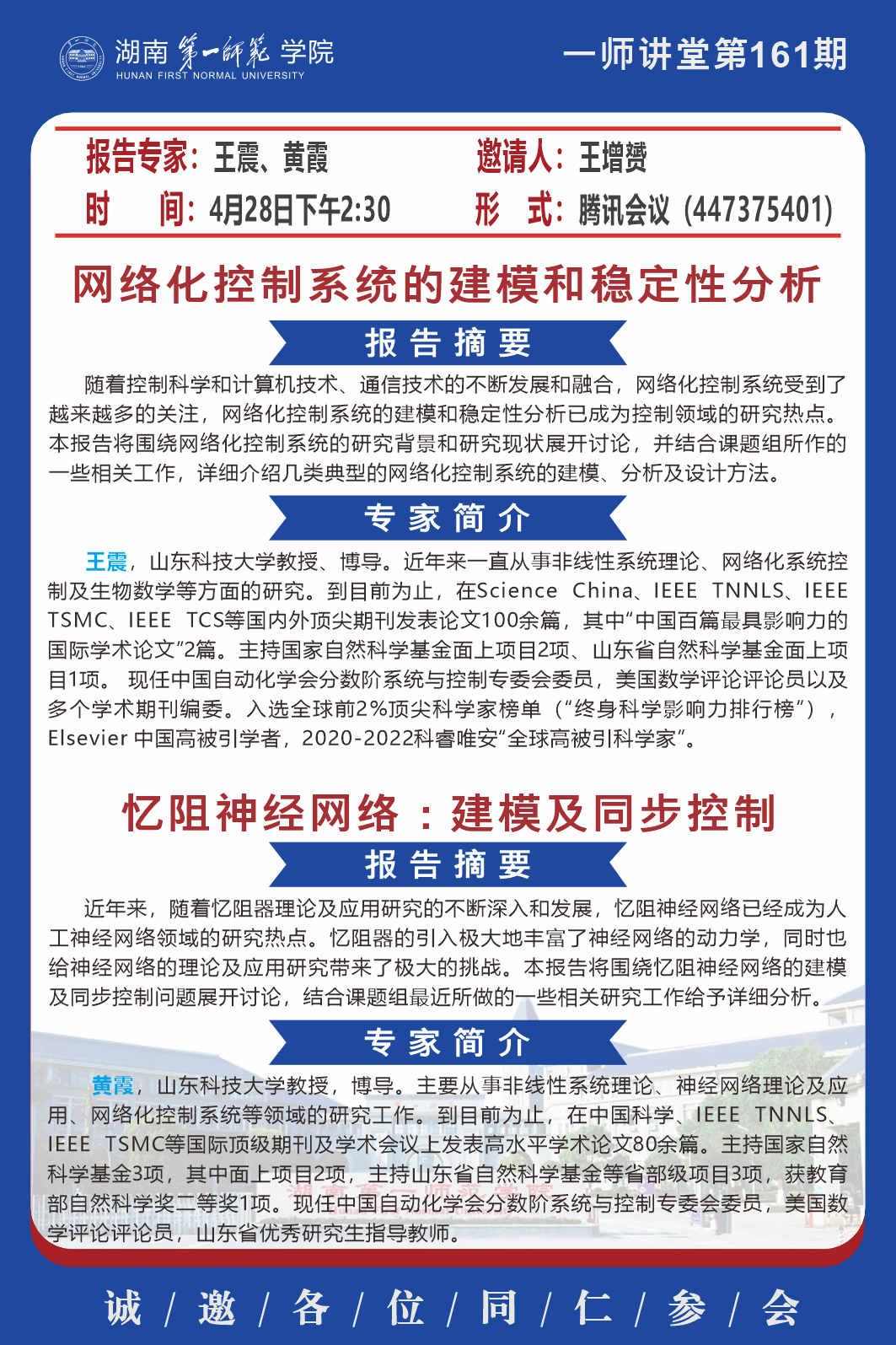 下一篇:学术预告|一师讲堂第160期:Some Development on Nonlocal Dsipersal Equations; The Stability of Diverging Traveling Fronts and Threshold Phenomenon for the Buffered Bistable System; 一类传染病模型的传播性质;Effect of Nonlocality on the Dynamics of Memory-based Diffusion Equations