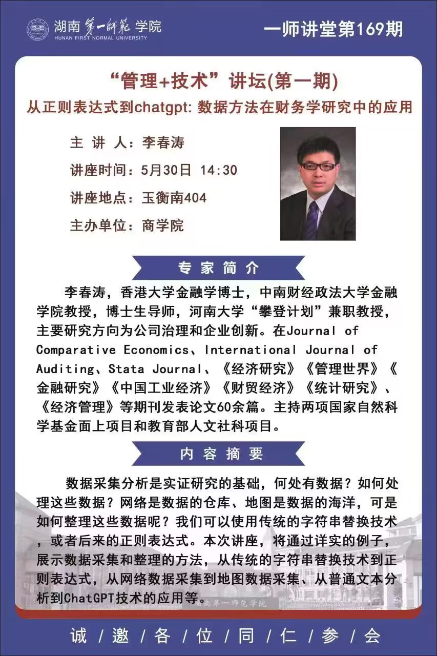 学术预告|一师讲堂第169期:“管理+技术”讲坛(第一期)-从正则表达式到chatgpt:数据方法在财务学研究中的应用