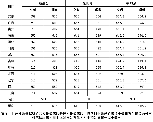 2018年我校高招录取新生最高分、最低分、平均分统计表(省外文化类)