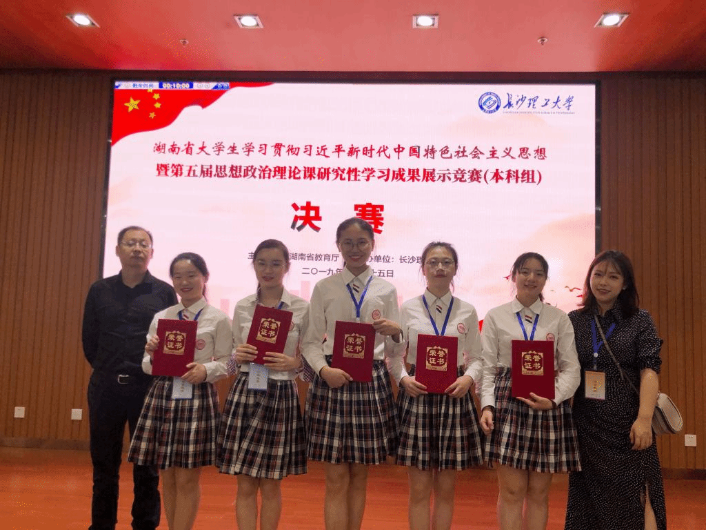 5月25日,由湖南省教育厅举办的“湖南省大学生学习贯彻习近平新时代中国特色社会主义思想暨第五届大学生思想政治理论课研究性学习成果展示竞赛决赛(本科组)”在长沙理工大学举行。经过校内初赛、复赛重重遴选,来自我校文传院739班由肖彦、肖霄老师指导的刘雨晨、张薇、张占鑫、钟志芳、陈昱伶五位同学代表我校参加并取得了二等奖。