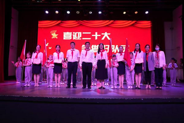 王玉清一行先后参观了一附小、二附小校园,详细了解了两所附小的办学特色、育人理念及校舍情况,满心关切附小师生的成长发展。随后,在少先队员的邀请下,慰问团队出席了一附小在礼堂举行的2021级一年级首批新队员入队仪式,王玉清、黄智勇、蒋蓉、曾晓洁登台为一年级新成立的四个中队授中队旗,并为辅导员颁发了聘书。在二附小,一行人走进六一文艺汇演现场,观看了孩子们的演出。舞台上,孩子们扮演的憨态可掬的小企鹅和阳光自信的小星星形象,给领导们留下来深刻印象。王玉清高度肯定了孩子们的精彩表现,同时鼓励小朋友们继承学校优良传统,让红色火种生生不息,代代相传。
