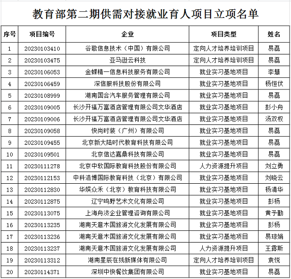 近日,教育部学生司公布了第二期供需对接就业育人项目立项名单。我校共有20个项目被批准立项,其中,定向人才培养培训项目3个、就业实习基地项目15个、人力资源提升项目2个。