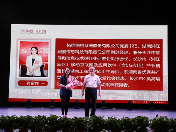 9月19日下午,我校在东方红校区田汉剧场举行聘任仪式,拓维信息系统股份有限公司党委书记、湖南湘江鲲鹏信息科技有限责任公司副总经理肖前辉受聘为我校客座教授。校党委委员、副校长曹兴出席仪式,教师工作部部长、人事处处长黄小喜主持仪式。