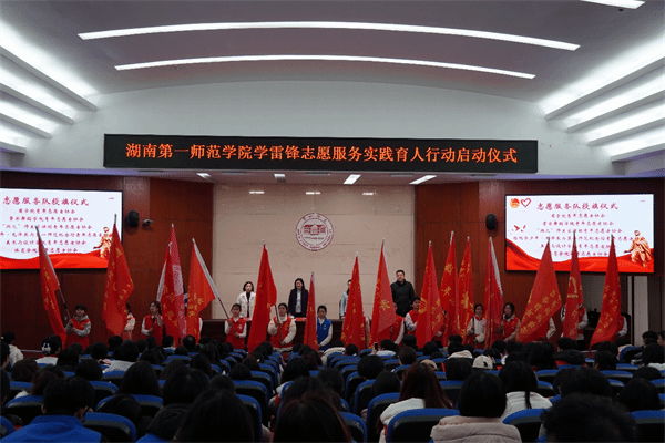 启动仪式上,对表现突出的优秀志愿服务团队进行了授旗,激励一师学子投身志愿服务活动,自觉弘扬传承雷锋精神。“毛泽东与第一师范”纪念馆的邹磊老师与“润之”师生宣讲团的同学们共同带来了一堂生动的“雷锋精神”大思政课。张艺宁同学的《好工人、好农民、好战士》讲述和情景剧《雷锋之光 永恒照耀》的表演,使雷锋形象更加深入人心,在场师生身临其境地感受青年雷锋的经历,在喜闻乐见中接受思政教育。