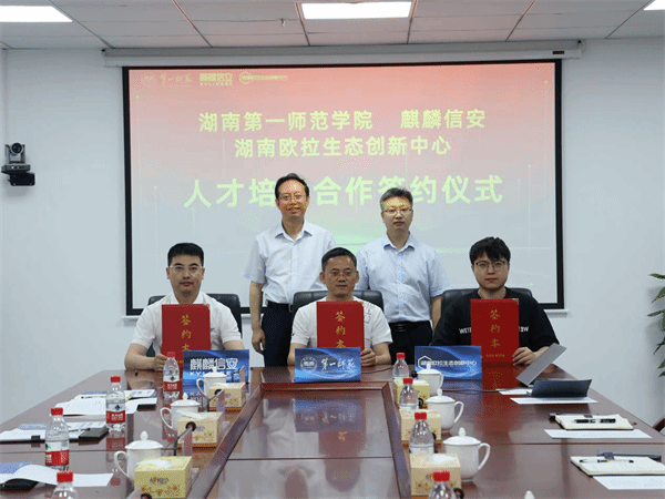 5月14日,我校与麒麟信安、湖南欧拉生态创新中心人才培养合作协议签约仪式在长沙麒麟科技园举行。副校长石元泉、麒麟信安副总裁王忠锋等出席签约仪式。